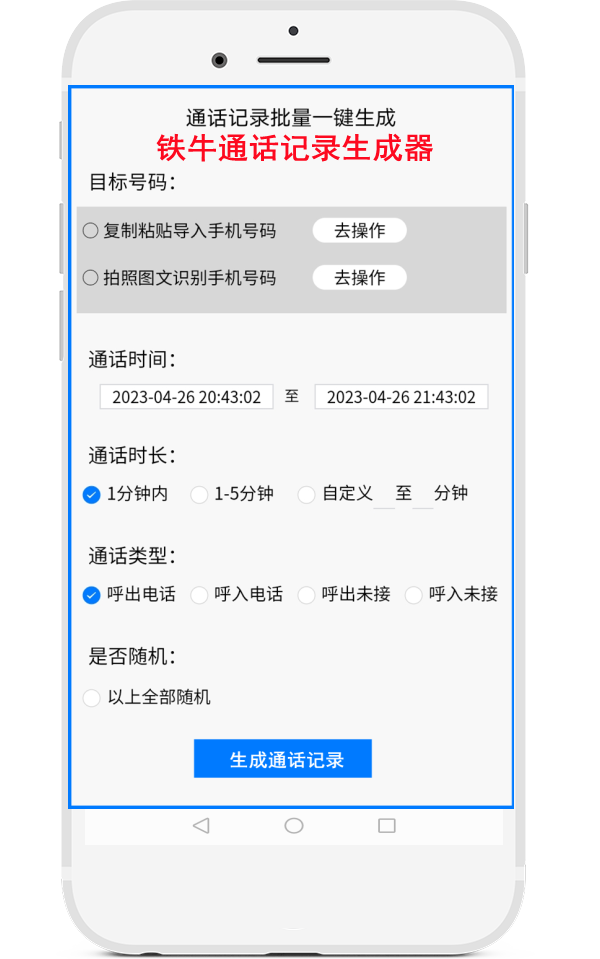 铁牛通话记录生成器的功能:一键批量导入手机号码,批量生成通话记录。